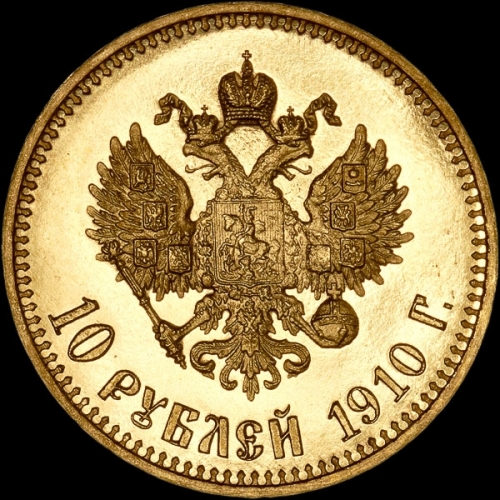 Реверс: В центре изображен Малый Государственный Герб Российской империи - двуглавый орёл, головы которого увенчаны двумя коронами, третья, большая корона над ними. Все они соединены орденской лентой ордена Св. апостола Андрея Первозванного. На груди орла расположен Московский герб - щит с изображением Георгия Победоносца с копьём поражающего дракона. Вокруг щита цепь ордена Св. апостола Андрея Первозванного. На крыльях изображены гербы: Царства Казанского, Польского, Херсонеса Таврического, Астраханского, Сибирского, Грузинского и герб соединенных княжеств Киевского, Новгородского и Владимирского — по 4 на каждое крыло. В правой лапе орла – скипетр, в левой – держава. Под ним слева направо изображены: номинал - надпись «10 РУБЛЕЙ» и дата выпуска «1910 Г.». По окружности канта имеются рельефные элементы, выполненные в виде зубцов.