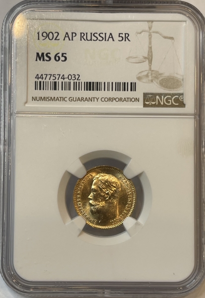 Золотая монета 5 рублей Николай II 1902 г. в слабе NGC MS 65