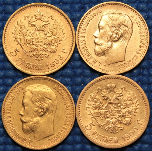 Реверс монеты Царской России 5 рублей 1899 год: Центральная часть штемпеля занимает изображение профиля императора Николая II. Слева, вдоль буртика надпись следующего содержания: «Б.М.НИКОЛАЙ II ИМПЕРАТОРЪ», справа надпись продолжена «И САМОДЕРЖЕЦЪ ВСЕРОСС.». Вдоль буртика монеты расположен зубчатый ободок.