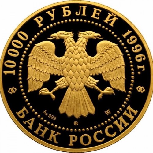 изображение двуглавого орла (художник И. Билибин), по кругу надписи: вверху - "10 000 РУБЛЕЙ 1996", внизу - "БАНК РОССИИ". В нижней части - обозначение металла, проба сплава, содержание драгоценного металла в чистоте и товарный знак монетного двора.