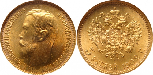 В эпоху Императора Николая II золотые монеты 5 рублей чеканились в период с 1897 до 1911 года с небольшим перерывом, имели хождение в Российской Империи наравне с бумажными деньгами.