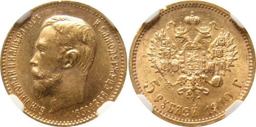 В 1910 году пятирублевая монета изготавливалась Санкт-Петербургским монетным двором из золота 900 пробы относительно небольшим тиражом, потому сейчас её цена значительно выше других пятирублевых монет эпохи Николая 2. Обычно цена золотых монет зависит от стоимости металла, из которого она выполнена, её состояния и сохранности. Редкие разновидности этой монеты пока не найдены.